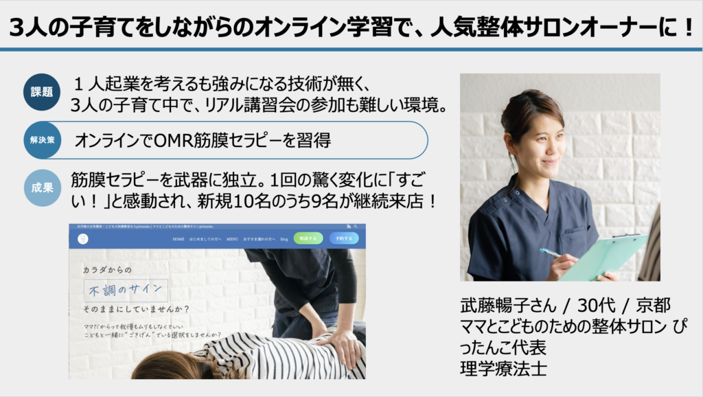 1年間の集中プログラムで、痛みやしびれ、めまい、耳鳴り、生理痛、不定愁訴など、あらゆる不調に対応できるようになった受講生の声をお聞きください。